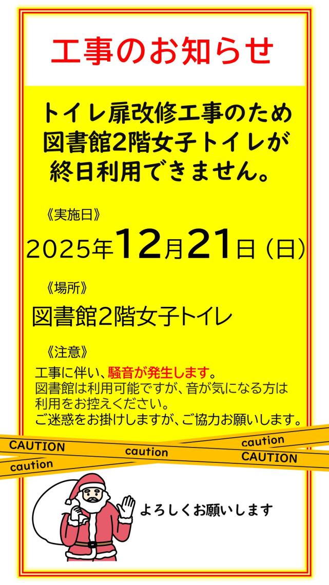 トイレ扉改修工事のため、下記日程において図書館2階女子トイレが利用できません。